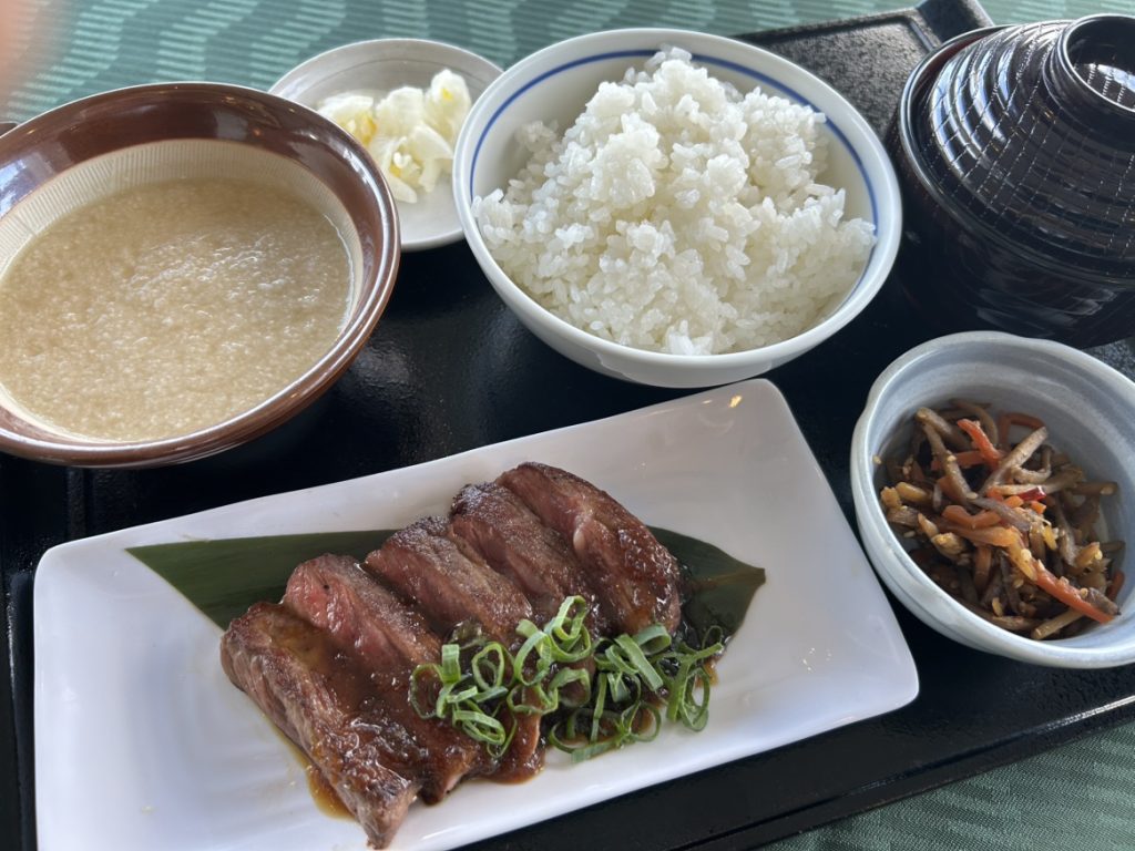 自然薯・牛焼肉・小鉢・麦御飯・味噌汁・お新香